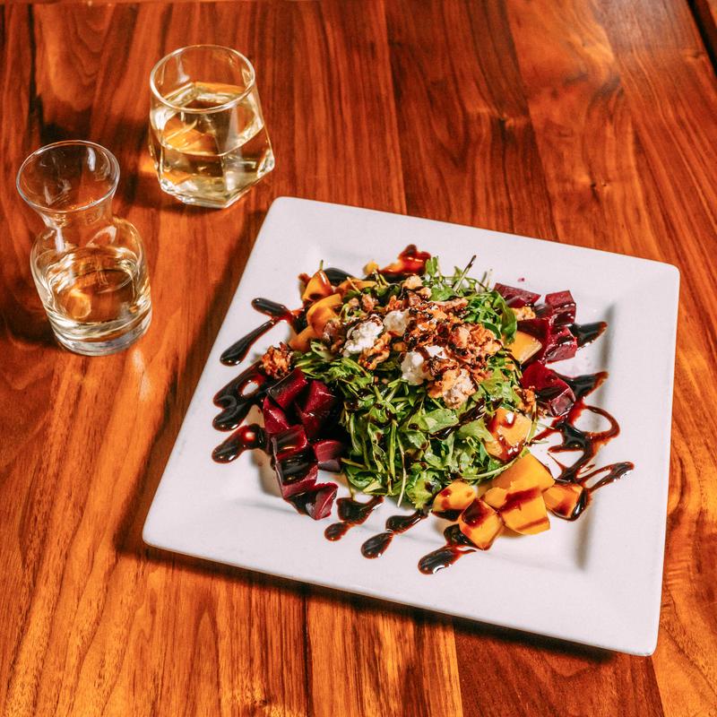 Diced gold and red beets, arugula, crispy applewood smoked bacon, candied walnuts, goat cheese, honey orange dressing, balsamic reduction
